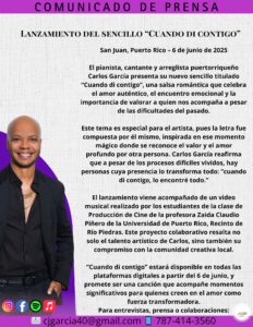 San Juan, Puerto Rico – El pianista, cantante y arreglista puertorriqueño Carlos García presenta su nuevo sencillo titulado “Cuando di contigo”, una salsa romántica que celebra el amor auténtico, el encuentro emocional y la importancia de valorar a quien nos acompaña a pesar de las dificultades del pasado.