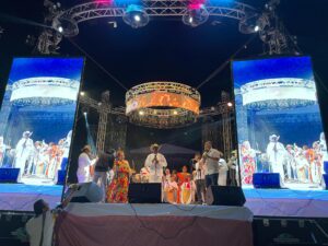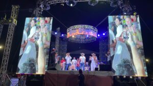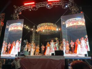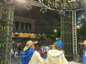 La tarima de Interfilm Produccion , magestuosa con pantallas de última generación y un diseño circular y moderno, esperaba que iniciara el espectàculo, con luces, destellos de llamas, corona imersiva con Noche de Tambò, lucieron luces altas y proyectaban a los danzantes, que ávidos y llenos de estupor, giraban alrededor al contrario de las manijas del reloj como se baila la cumbia de verdá verdá.